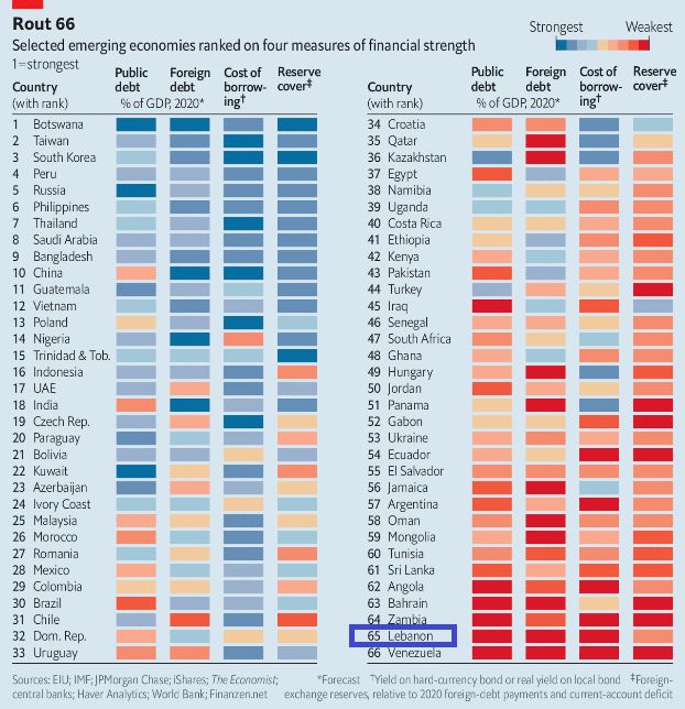 وفي التفاصيل أنّ التقرير (نُشر يوم السبت) يُصنّف البلدان وفقاً لـ 4 مؤشرات للقوة المالية: الدين العام، الدين الخارجي، تكلفة الاقتراض وغطاء الاحتياطي.