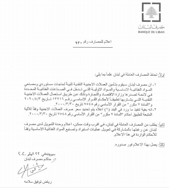 أصدر حاكم مصرف لبنان رياض سلامة قراراً، أشار فيه إلى أن المصرف سيقوم بتأمين العملات الاجنبية النقدية تلبية لحاجات مستوردي ومصنعي المواد الغذائية الاساسية والمواد الاولية التي تدخل في الصناعات الغذائية المحددة في لائحة تصدرها وزارة الاقتصاد والتجارة.