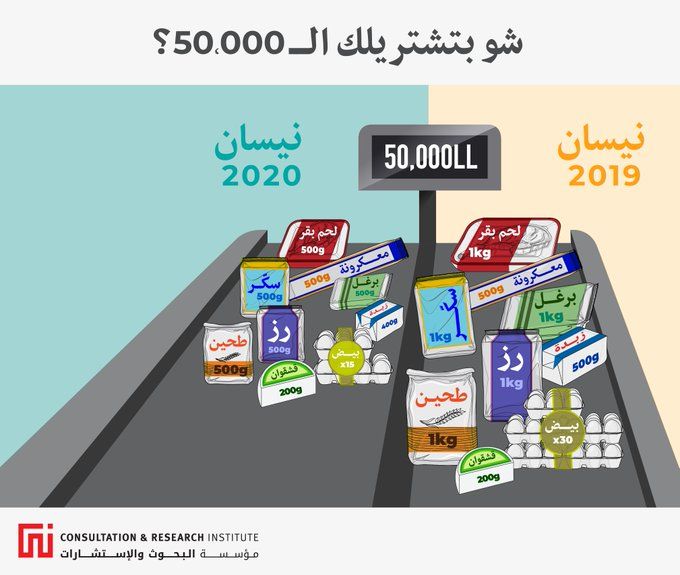 وتظهر الصورة أنّ الـ50 ألف باتت تشتري نصف كليو من اللحم البقر ونصف كيلو معكرونة ونصف كيلو سكر ونصف كيلو برغل ونصف كيلو رز ونصف كيلو طحين وأوقية قشقوان و15 بيضة و400 غرام زبدة. في المقابل، كانت ورقة الـ50 ألف تشتري في نيسان 2019 كيلو من اللحم البقر وكليو سكر ونصف كيلو معكرونة وكليو برغل وكيلو رز ونصف كيلو زبدة وكيلو طحين و30 بيضة وأوقية قشقوان.