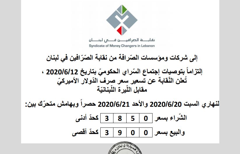 أعلنت نقابة الصرافين في لبنان تسعير سعر صرف الدولار الأميركي مقابل الليرة اللبنانية لنهار السبت 20-06-2020 حصراً بهامش متحرك بين الشراء بسعر 3850 كحد ادنى والبيع بسعر 3900 كحد أقصى. اشترك فى النشرة البريدية لتحصل على اهم الاخبار بمجرد نشرها تابعنا على مواقع التواصل الاجتماعى