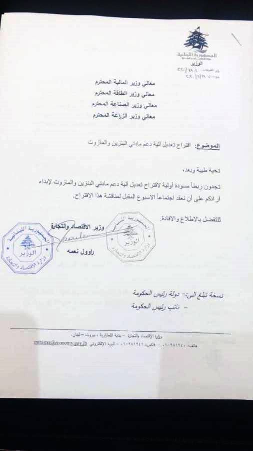 يبدو أن الحكومة ماضية جدياً في وقف الدعم عن مادتي البنزين والمازوت، ولهذه الغاية صدر عن وزير الإقتصاد والتجارة راوول نعمه إقتراحا للدرس والمناقشة من قبل الحكومة يرمي الى وقف الدعم عن مادتي البنزين والمازوت بشكلٍ عام وإستبدال الدعم بقسائم قليلة مدعومة لتوزع على الأفران والمعامل وشريحة محددة من ذوي الدخل المحدود.
