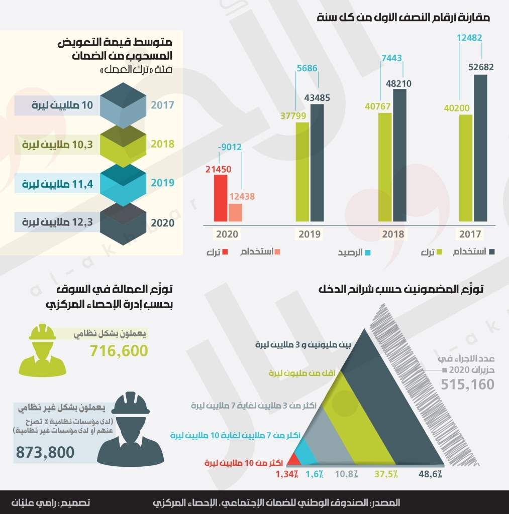 تكشف إحصاءات الصندوق الوطني للضمان الاجتماعي في الأشهر الستة الأولى من الأعوام 2017 - 2020، عن تحوّل جذري في مسار سوق العمل من رصيد إيجابي إلى رصيد سلبي سيبقى أثره لفترة طويلة. ففي السنوات الماضية، كان صافي حركة الاستخدام والترك من العمل إيجابياً دائماً، أي إنّ عدد الأجراء الجدد المسجّلين في الصندوق كان دائماً أعلى من عدد الأجراء الذي تركوا العمل. رصيد هذه الحركة بدأ ينكمش تدريجياً في السنوات الثلاث الأخيرة، وصولاً إلى تحقيق رصيد سلبي في النصف الأول من 2020. في النصف الأول من 2017 سُجّل في الضمان استخدام 52682 أجيراً، وسُجّل ترك 40200 أجير، أي برصيد إيجابي بلغ 12482 أجيراً.
