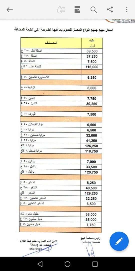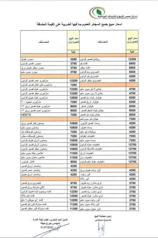 وفي ما يلي جدول بالأسعار الجديدة المُعتمَدة من إدارة حصر التبغ والتنباك، والتي دخلت حيّز التنفيذ بدءاً من اليوم الأول من تموز.