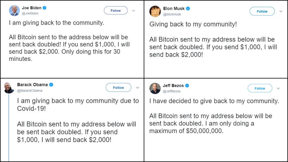 وذكرت وسائل إعلام أن مجموعة هكرز اخترقت بشكل متزامن حسابات لبيل غيتس، وإيلون ماسك، وباراك أوباما، وجيف بيزوس، ومايكل بلومبرغ، ومغني الراب كاني ويست، بالإضافة إلى حسابات شركات مثل "أبل".