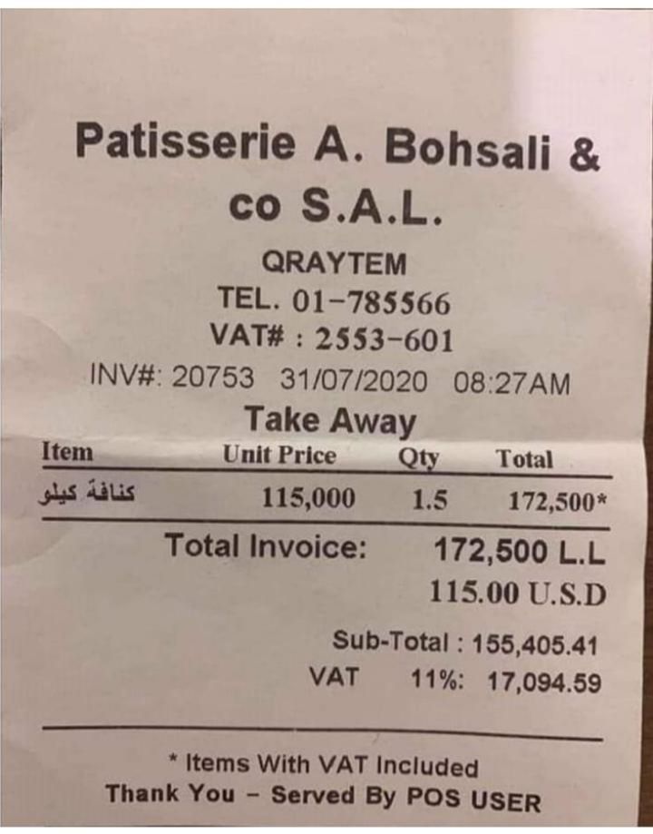 كلما ارتفع الدولار كلما ارتفعت أسعار المواد الغذائية. ونتيجة لجنون الدولار في السوق السوداء، ارتفع سعر كيلو الكنافة، إذ تم بيعه بـ115 ألف ليرة لبنانية "فقط"!