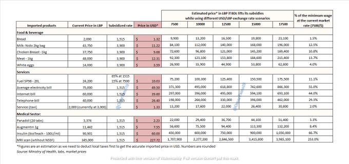 ويشرح الجدول الأسعار المرتقبة إذا ما وصل سعر الدولار إلى 7500 ليرة و10 آلاف و12500 ليرة و15 ألف ليرة و17500 ليرة.