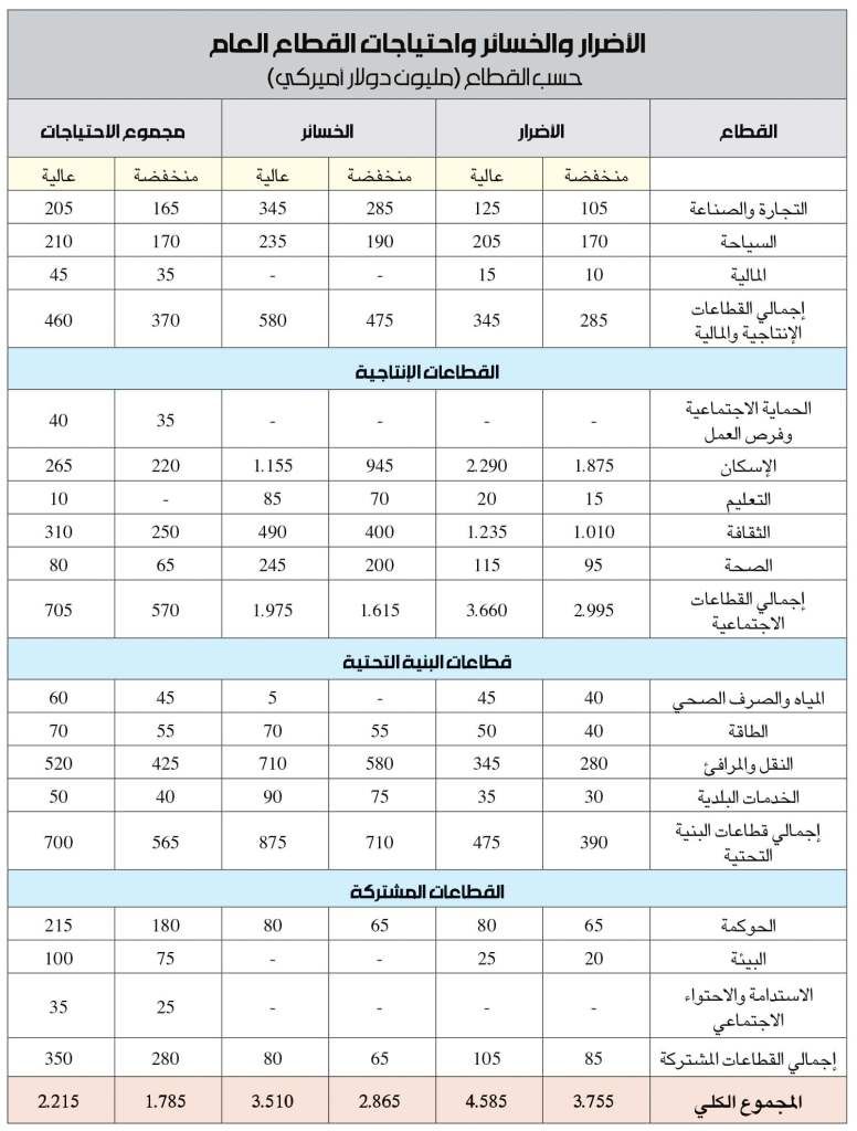 أما احتياجات النهوض والتعافي وإعادة الإعمار، فهي تقدّر بين 1٫8 مليار دولار وبين 2٫2 مليار دولار من ضمنها حاجة سريعة تصل إلى 760 مليون دولار في مهلة لا تتجاوز كانون الأول 2020.