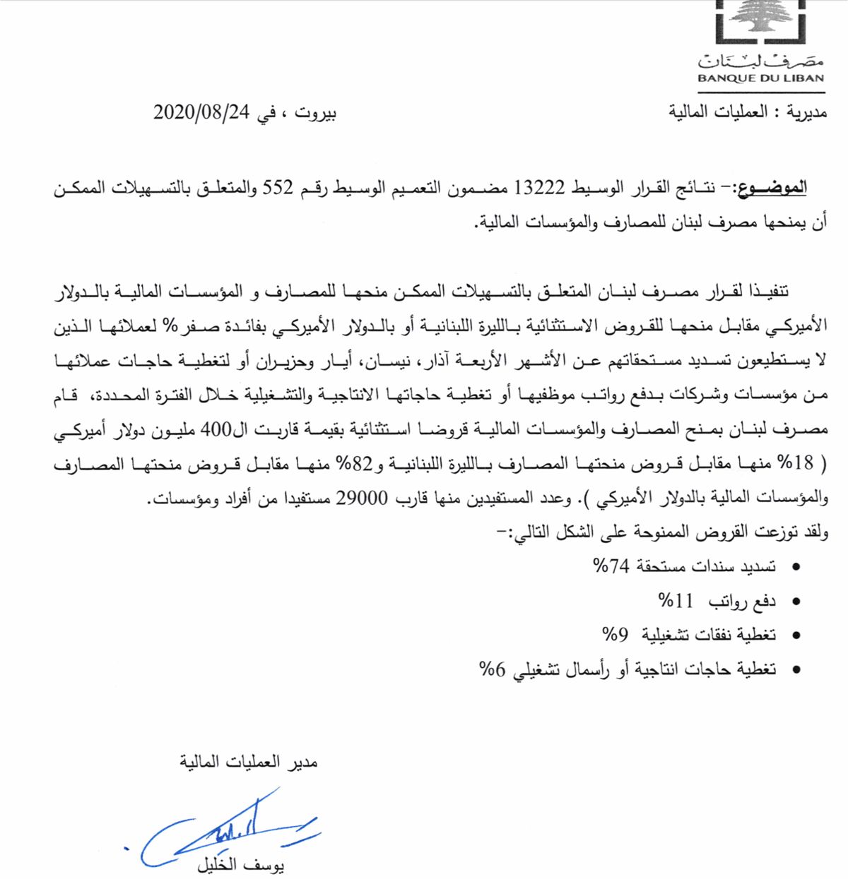 قام مصرف لبنان بمنح المصارف والمؤسسات المالية قروضا استثنائية بقيمة قاربت الـ400 مليون دولار أميركي، وعدد المستفيدين منها قارب 29000 مستفيدا من أفراد ومؤسسات. اشترك فى النشرة البريدية لتحصل على اهم الاخبار بمجرد نشرها تابعنا على مواقع التواصل الاجتماعى