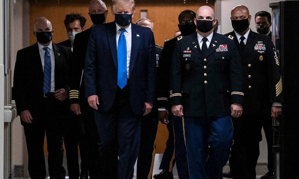 وضع الرئيس الأميركي دونالد ترامب قناعاً للمرة الأولى في مكان عام السبت خلال زيارته مركزاً طبياً، مذعنا للضغوط كي يكون مثالا في مجال الصحة العامة مع اشتداد وتيرة الإصابات بفيروس كورونا في أنحاء الولايات المتحدة.