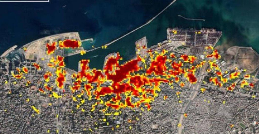 وعلى الخريطة المرفقة تمثل النقاط “البيكسلات” الحمراء الداكنة، مثل تلك الموجودة داخل وحول مرفأ بيروت، الضرر الأشد.