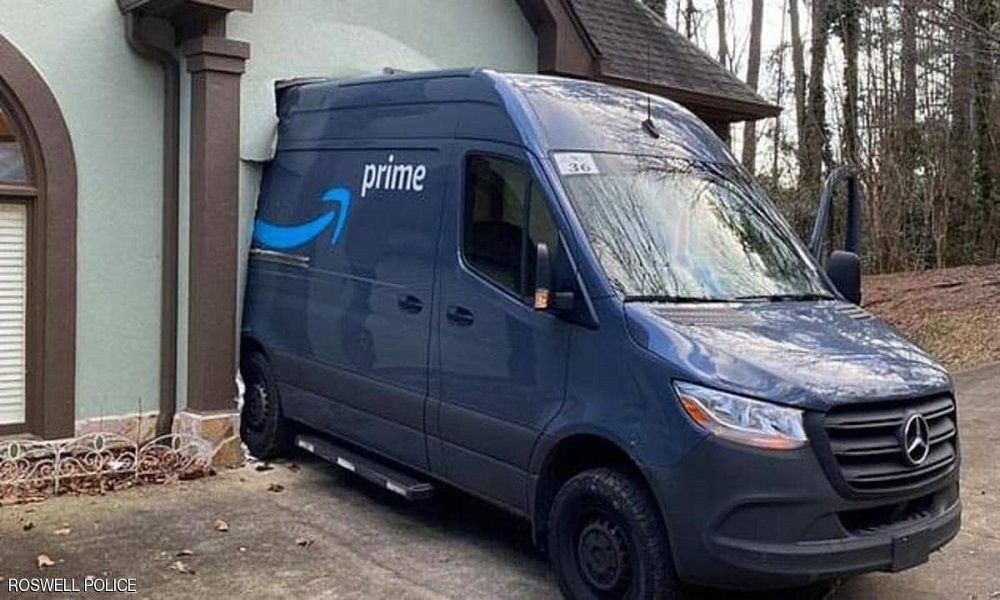 اصطدمت شاحنة عامل توصيل لدى شركة “أمازون”، بالباب الأمامي لأحد المنازل، في ولاية جورجيا الأميركية.