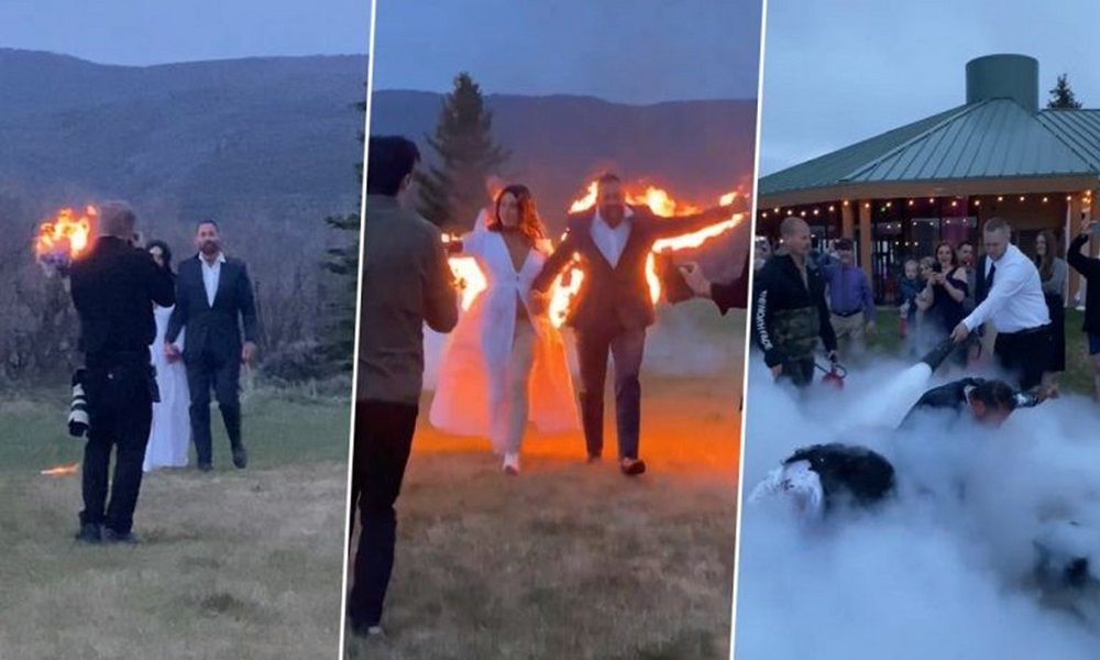 ويظهر الفيديو الزوجين يقفان بثقة إلى جانب بعضهما ويمسكان بيديهما قبل أن يشعل أحدهم زهور العروس وتنتقل النار تلقائياً إلى فستانها وبدلة العريس.