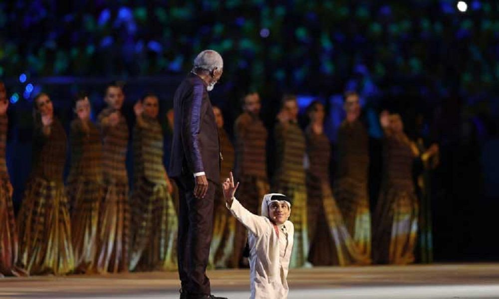 لفت شاب قطري ولد بمرض نادر منع نمو الجزء السفلي من جسده الانتباه في افتتاح مونديال قطر برفقة الممثل الأميركي الشهير، مورغان فريمان.