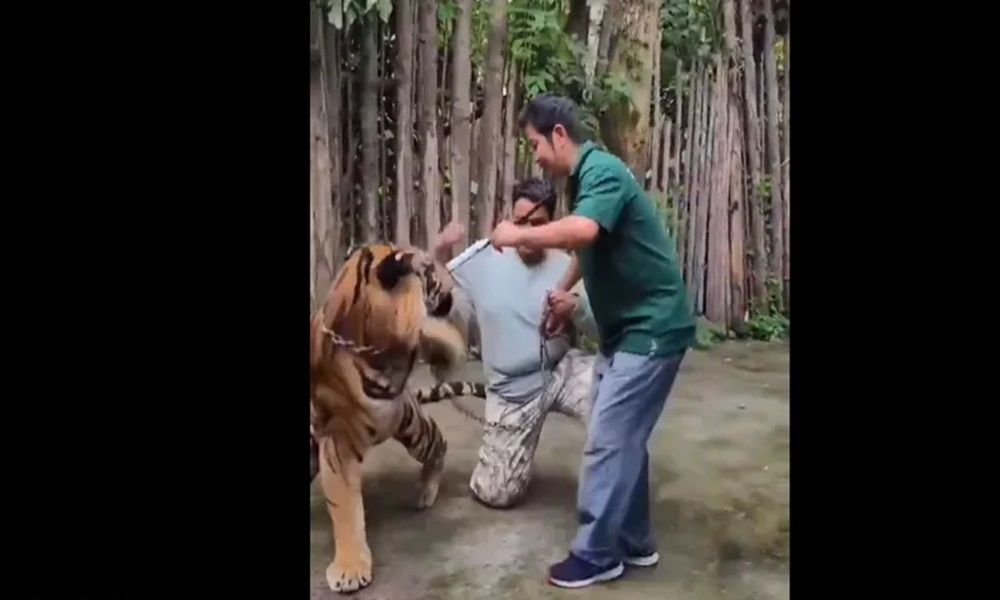 وثق مقطع فيديو لحظة هجوم نمر ضخم على سائح حاول التقاط صورة “سيلفي” معه، داخل أحد المرافق السياحية في تايلاند.
