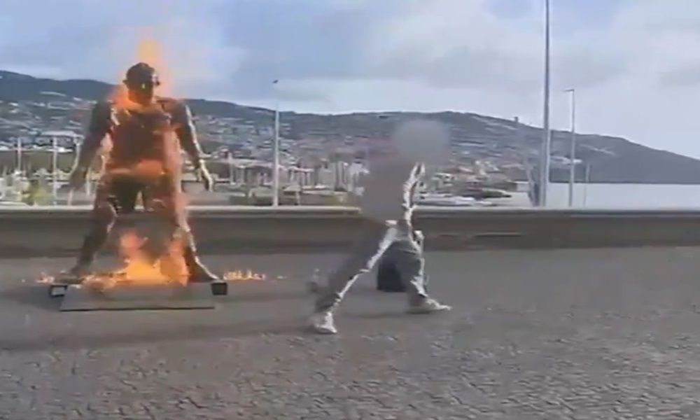 ويظهر الفيديو، الشاب وهو يسكب سائلًا قابلًا للاشتعال على التمثال الواقع أمام متحف “CR7” في فونشال، عاصمة جزيرة ماديرا، والذي أقيم تخليدًا لمسيرة اللاعب الأسطورية.