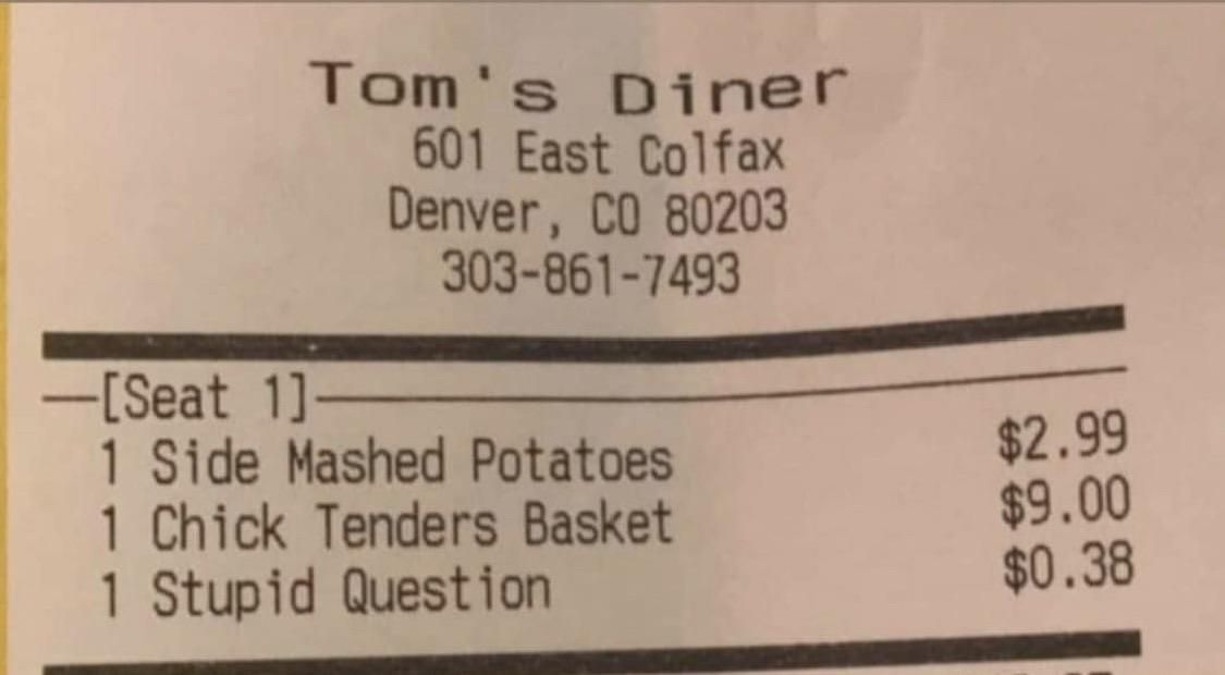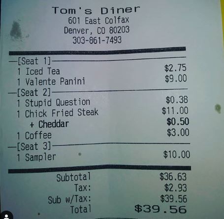 يفرض مطعم Tom’s Diner في دنفر عمولة اضافية على زبائنه الذين يطرحون على النادل أسئلة “غبية”. وعمد المطعم الى زيادة عمولة “السؤال الغبي” على قائمة الطعام مقابل 38 سنتا. اشترك فى النشرة البريدية لتحصل على اهم الاخبار بمجرد نشرها تابعنا على مواقع التواصل الاجتماعى