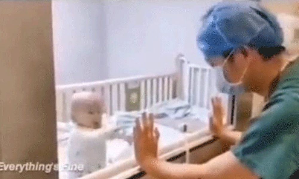 وظهر الطفل الذي على الأغلب لا يتعدى عمره بضعة أشهر وهو يلعب على سرير معزول داخل إحدى المستشفيات، بينما وقف الطبيب في الخارج يلاحظه ويشير إليه عبر الزجاج الفاصل، وكان الطفل يرفه بذراعيه وكأنه يريد الطبيب أن يحمله.