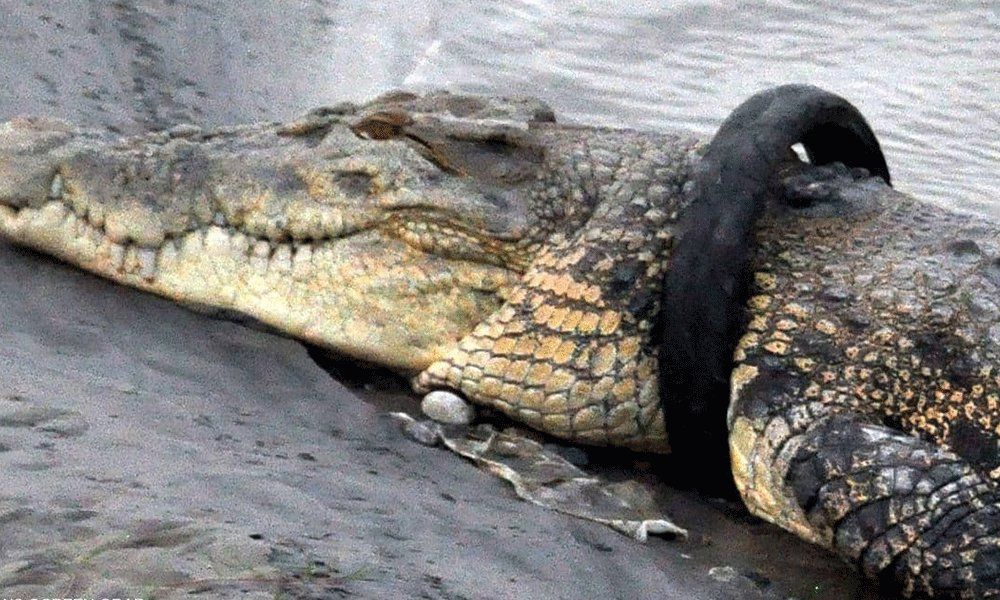 وعلى الرغم من تلك الكوارث، لا يزال إطار الدراجة البخارية ملتفا حول عنق التمساح، ومع نمو حجمه يزداد خطر تعرضه للاختناق.