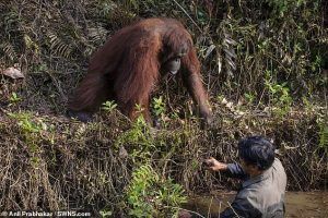 مدت قردة من نوع الأورانجوتان يدها لمساعدة رجل يقف داخل نهر، ربما ظنت أنه عاجز عن الخروج.