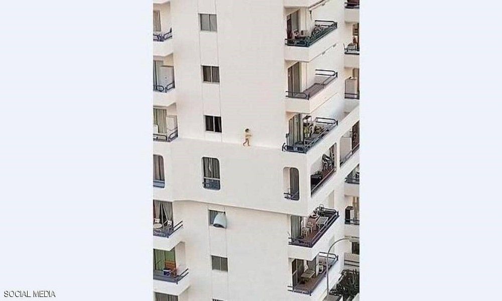 وشوهدت الطفلة وهي تمشي على طول الحافة الضيقة للواجهة الخارجية للبناية، على ارتفاع 25 مترا، بينما كانت الأم في الحمام، وحقق الفيديو مشاهدات بالجملة على مواقع التواصل.