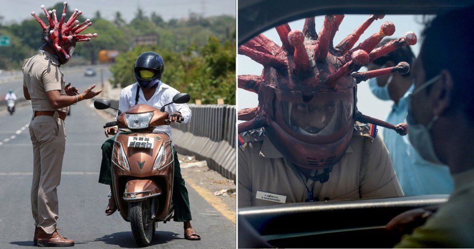 قرّر شرطي في الهند ارتداء خوذة على شكل فيروس كورونا لإخافة الناس عند رؤيته على الطريق خلال الدورية، علماً أن الهند في مرحلة إقفال لمدة 21 يوماً للحد من انتشار الفيروس المستجد.