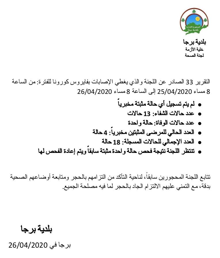 أعلنت "بلدية برجا"، اليوم الأحد، أنه "لم يتم تسجيل أي حالة إصابة جديدة بفيروس كورونا في نطاق البلدة"، مشيرة إلى أن العدد الإجمالي للحالات المسجلة هو 18، وينقسم على التالي: