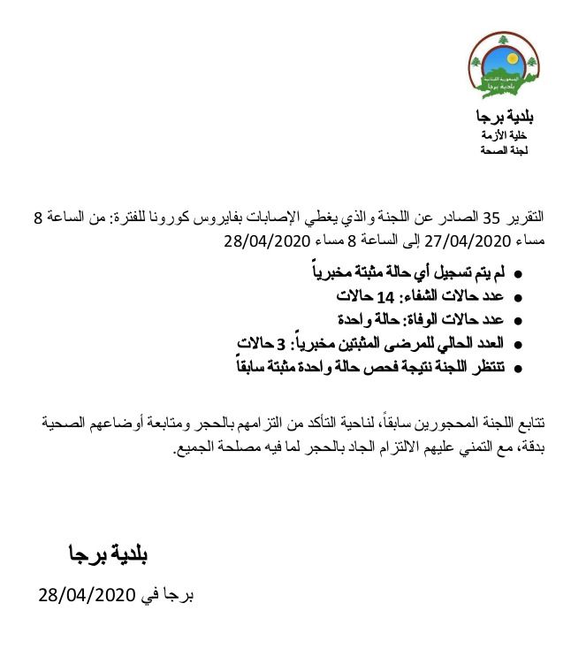 أعلنت "بلدية برجا"، اليوم الثلاثاء، أنه "لم يتم تسجيل أي حالة إصابة جديدة بفيروس كورونا في نطاق البلدة"، مشيرة إلى أن العدد الإجمالي للحالات المسجلة هو 18، وينقسم على التالي: