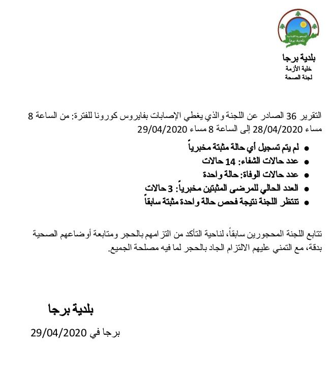 أعلنت "بلدية برجا"، اليوم الأربعاء، أنه "لم يتم تسجيل أي حالة إصابة جديدة بفيروس كورونا في نطاق البلدة"، مشيرة إلى أن العدد الإجمالي للحالات المسجلة هو 18، وينقسم على التالي:
