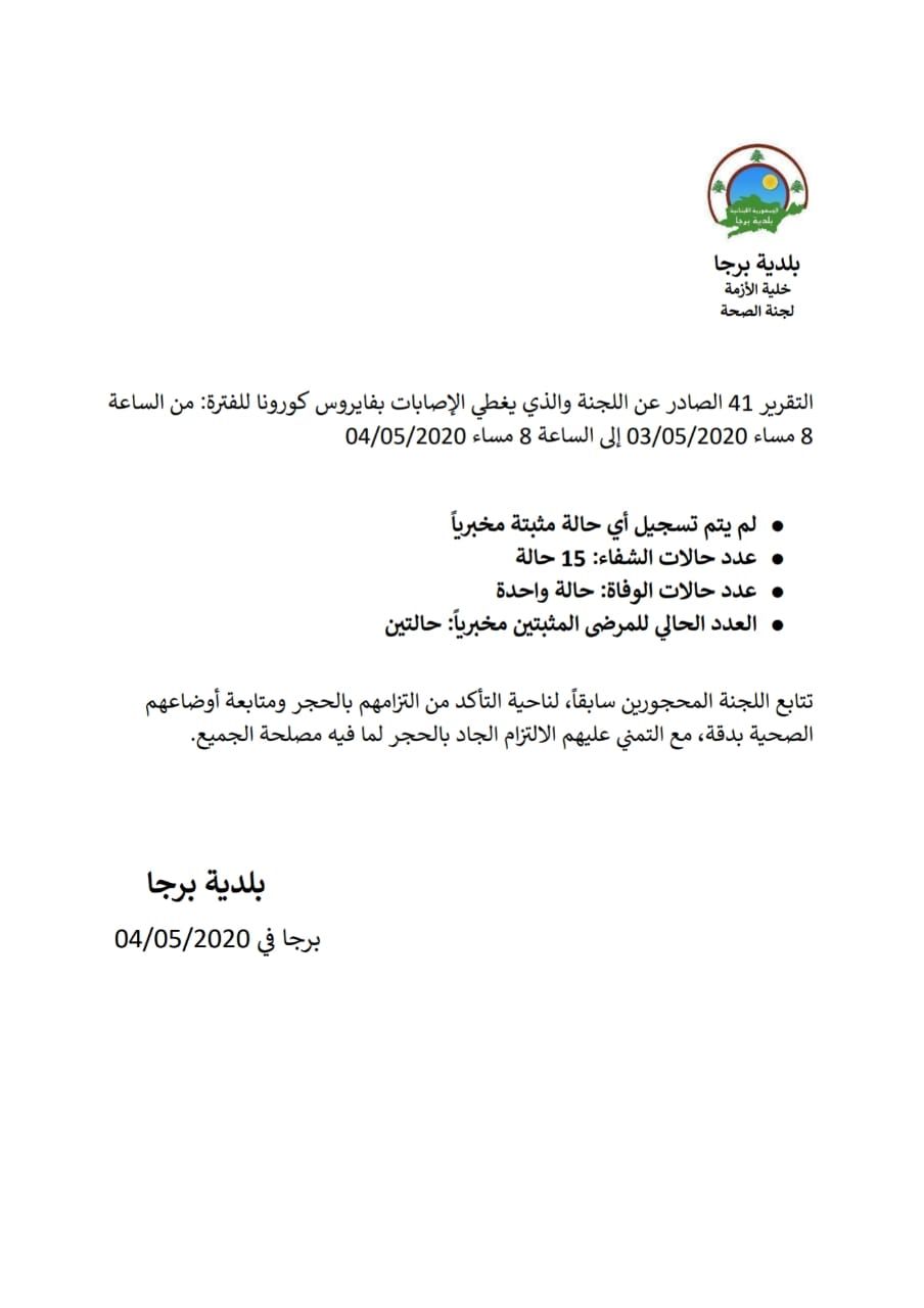 أعلنت "بلدية برجا"، اليوم الإثنين، أنه "لم يتم تسجيل أي حالة إصابة جديدة بفيروس كورونا في نطاق البلدة"، مشيرة إلى أن العدد الإجمالي للحالات المسجلة هو 18، وينقسم على التالي: