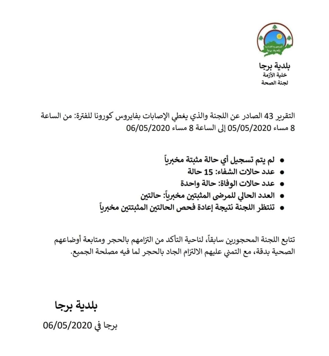 أعلنت "بلدية برجا"، اليوم الثلاثاء، أنه "لم يتم تسجيل أي حالة إصابة جديدة بفيروس كورونا في نطاق البلدة"، مشيرة إلى أن العدد الإجمالي للحالات المسجلة هو 18، وينقسم على التالي: