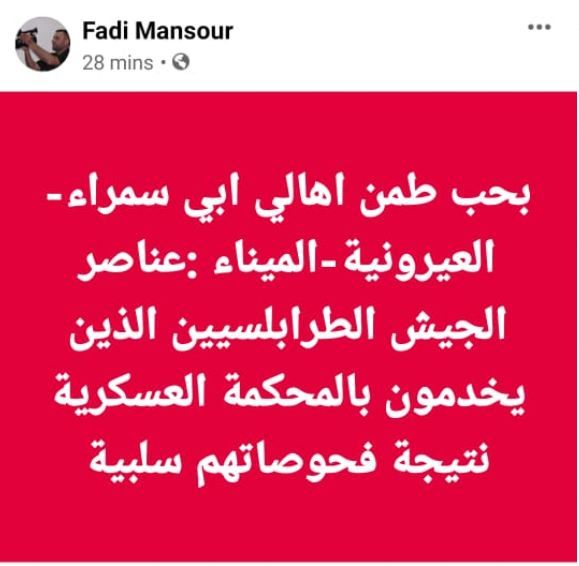 طمأن الإعلامي فادي منصور عبر حسابه على "فيسبوك"، أهالي مناطق الشمال بشأن عناصر الجيش الطرابلسيين في المحكمة العسكرية، والذي خضعوا لفحص فيروس "كورونا"، مؤكداً أن "نتيجة اختباراتهم جاءت سلبيّة".