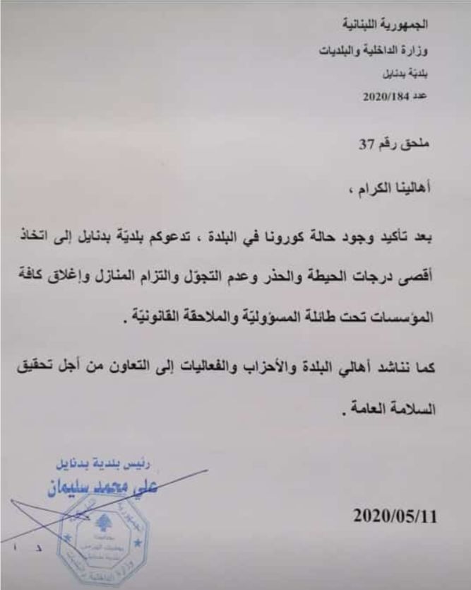 دعت "بلدية بدنايل" الأهالي إلى "اتخاذ أقصى درجات الحيطة والحذر وعدم التجوّل والتزام المنازل واغلاق كافة المؤسسات تحت طائلة المسؤولية والملاحقة القانونية، وذلك بعد تأكيد وجود حالة كورونا في البلدة".