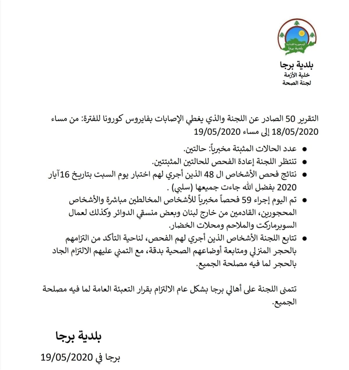 3- نتائج فحص الأشخاص الـ48 الذي أجري لهم اختبار يوم السبت بتاريخ 16 أيار 2020 جاءت جميعها سلبيّة.