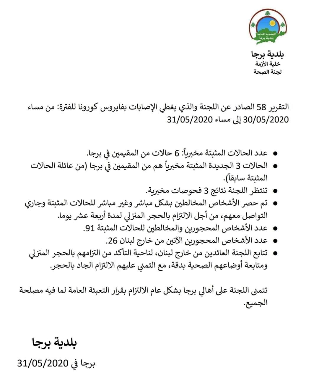 أعلنت "بلدية برجا" في بيان، اليوم الأحد، أنّ "عدد حالات كورونا في نطاقها إرتفع إلى 6 إصابات من المقيمين في البلدة"، موضحة أن "الحالات الـ3 الجديدة المثبتة مخبرياً هم من المقيمين في برجا، ومن عائلة الحالات المثبتة سابقاً".