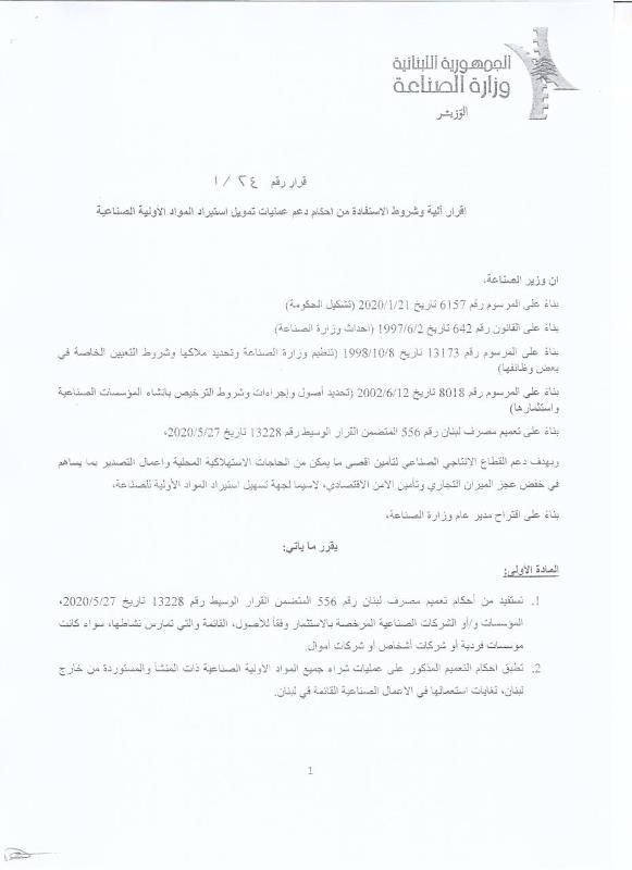 اثنى وزير الصناعة عماد حب الله، عطفا على الاتفاق الذي أعلن عنه اليوم بين وزارة الصناعة وجمعية المصارف حول دعم القطاع الصناعي، على مبادرة بنك عودة الالتزام ببنود الاتّفاق المذكور، بالاضافة الى أنه سيعمد إلى حصر سقف معدّل الفائدة على القروض الصناعية بمعدل BRR زائد صفر.