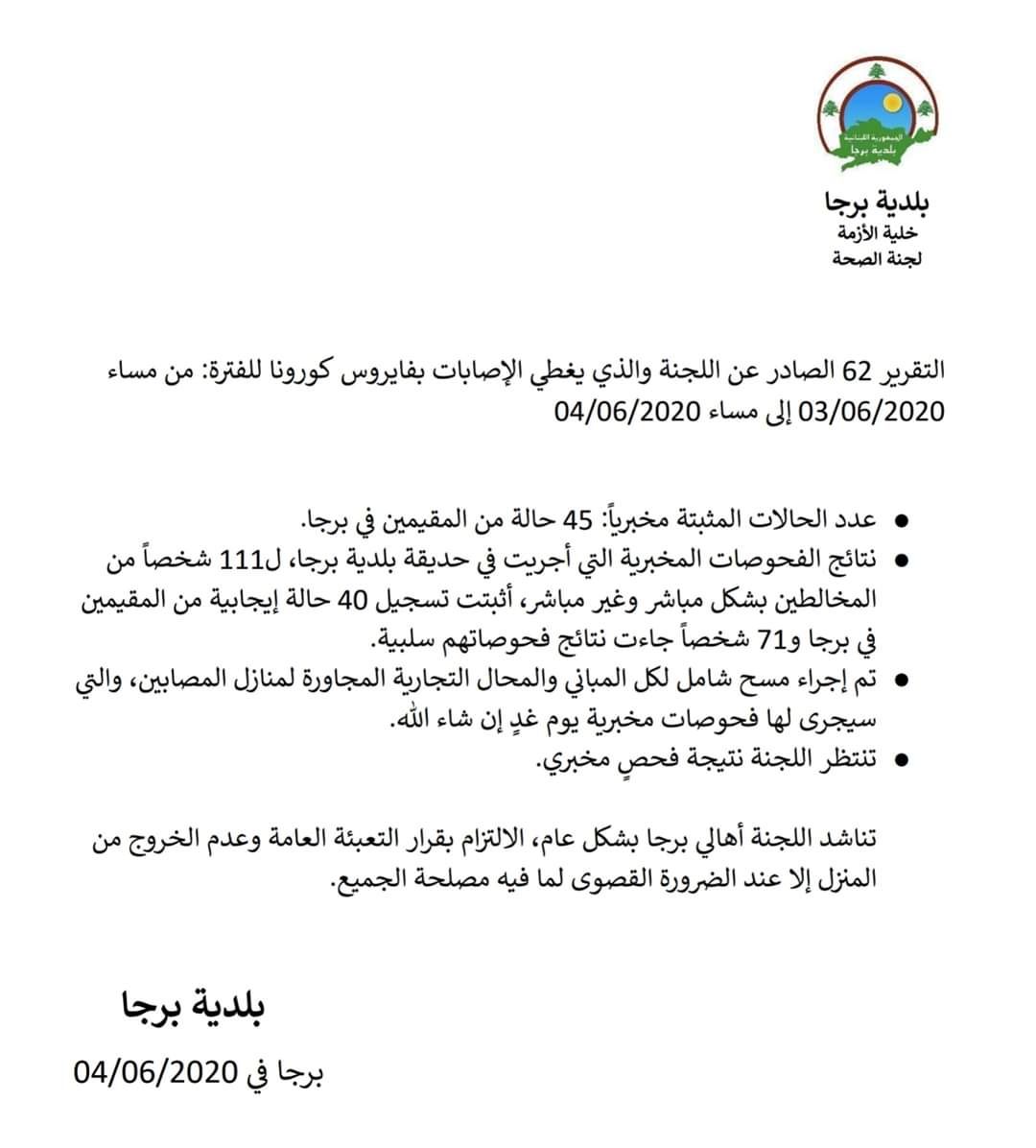 صدر عن اللجنة الصحية في خلية الأزمة في برجا بياناً جاء فيه: "متابعة للإجراءات الوقائية التي تعمل عليها خلية الأزمة، تم اليوم نقل جميع الأشخاص الذين أتت نتيجة فحصهم إيجابية من المقيمين، إلى مركز الحجر الذي إعتمد لإستضافة المصابين".