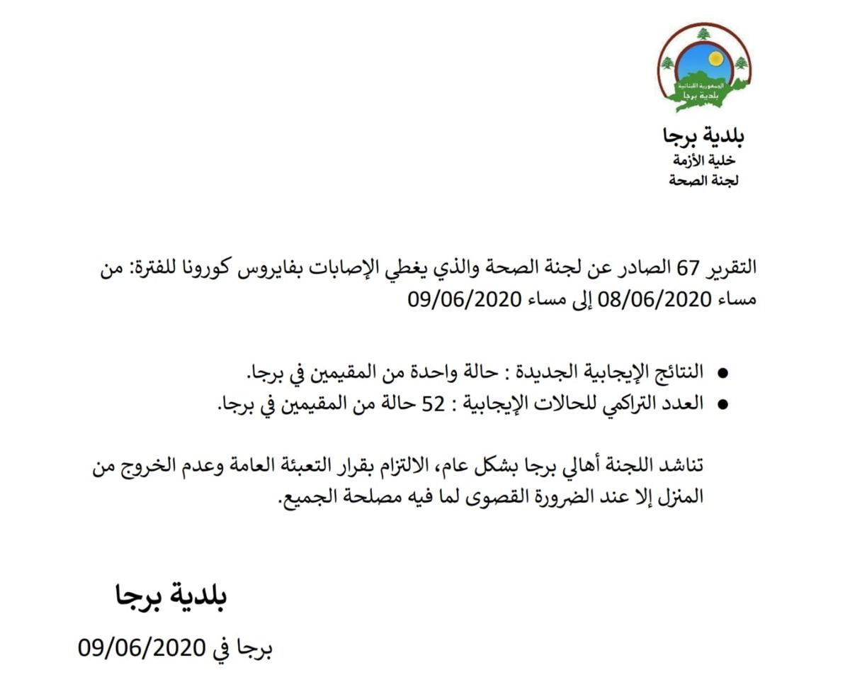 أعلنت "بلدية برجا"، اليوم الثلاثاء، عن تسجيل إصابة جديدة بفيروس "كورونا"، ما يرفع عدد الإصابات التراكمي إلى 52 حالة. ووفقاً لبيان البلدية، فإن النتيجة الإيجابية الجديدة هي لأحد المقيمين في البلدة. اشترك فى النشرة البريدية لتحصل على اهم الاخبار بمجرد نشرها تابعنا على مواقع التواصل الاجتماعى
