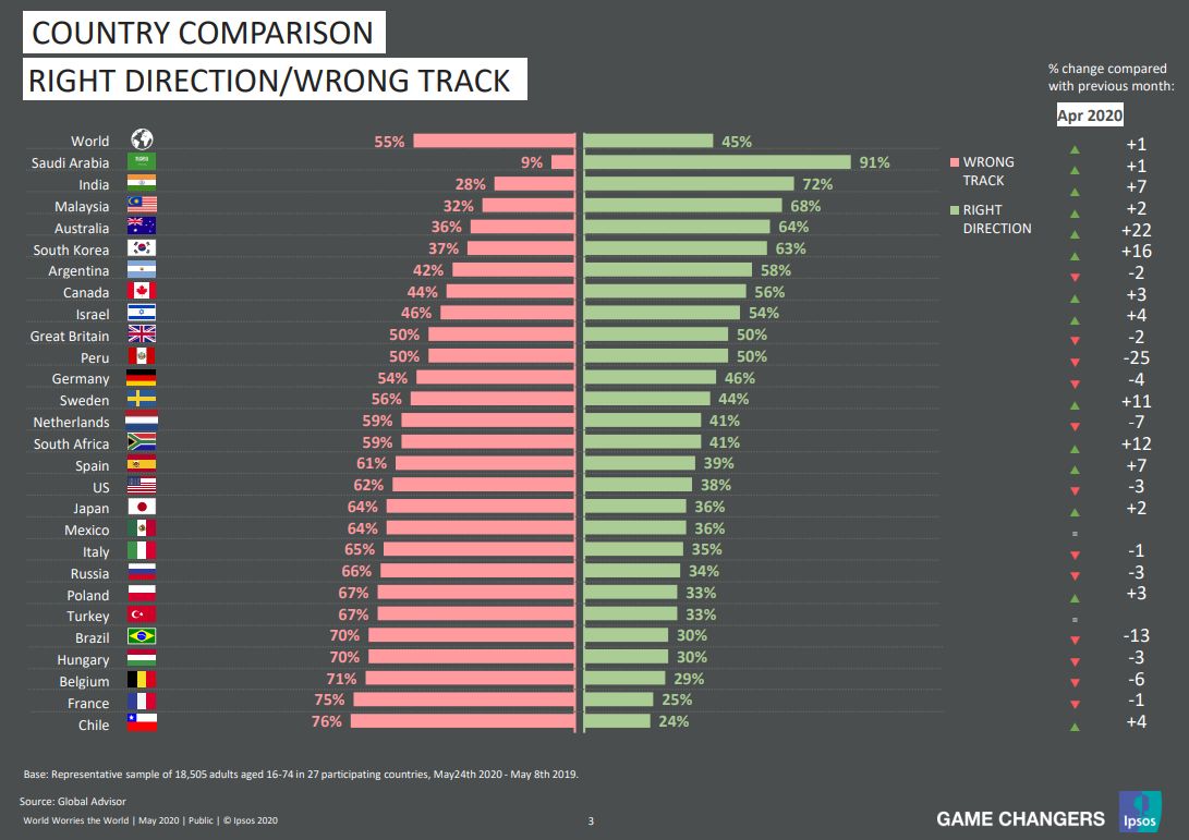وبشكل عام كانت المجر قلقة من الرعاية الصحية في المقام الأول، والمكسيكيون قلقون من الجريمة والعنف، فيما الروس قلقون من الفقر وعدم المساواة الاجتماعية.