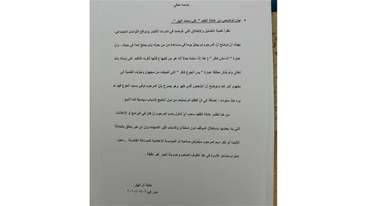 أصدرت عائلة الفقيد علي محمد الهق بياناً توضيحياً، رداً على "كمية التضليل والاختلاق التي عرضت في نشرات الأخبار ومواقع التواصل الإجتماعي".