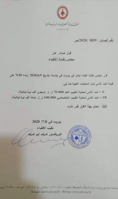 قرر مجلس نقابة أطباء لبنان في بيروت، خلال جلسته المنعقدة بتاريخ 9/6/2020، زيادة 30% على قيمة الحد الأدنى لبدل المعاينات الطبية كما يلي: