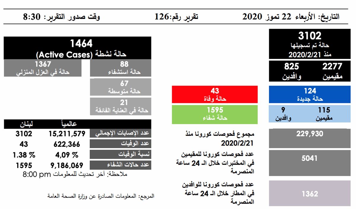أصدرت غرفة العمليات الوطنية لإدارة الكوارث تقريرها اليومي حول وباء كورونا المستجد، وأعلنت فيه تسجيل ١٢٤ حالة جديدة، ليصل العدد الإجمالي إلى ٣١٠٢. اشترك فى النشرة البريدية لتحصل على اهم الاخبار بمجرد نشرها تابعنا على مواقع التواصل الاجتماعى