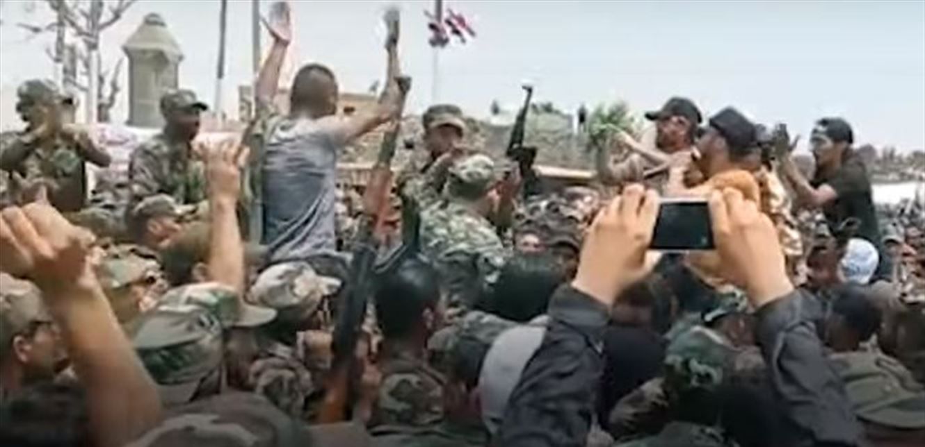 أطلق مقاتلون من الفيلق الخامس التابع للجيش السوري، هتافات ضدّ الرئيس السوري بشار الأسد وإيران، وذلك خلال حفل تخريج دفعة من المقاتلين خضعوا لدورة تدريبية، الثلاثاء 28 تموز، في محافظة درعا جنوب سوريا.