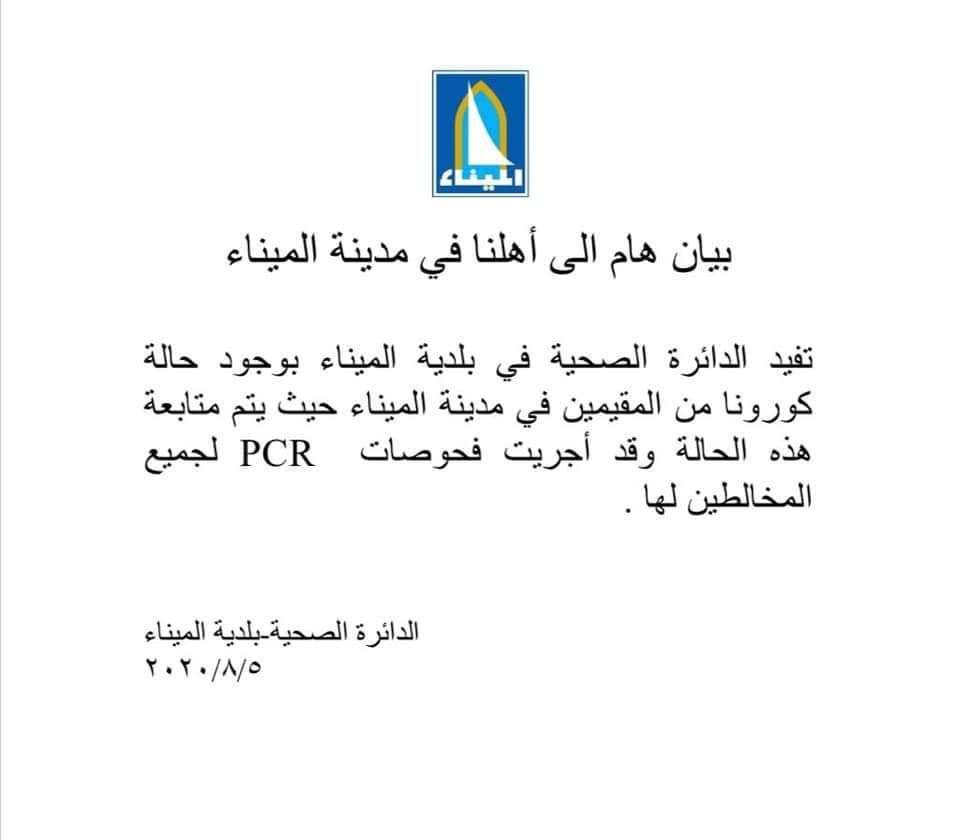 أفادت الدائرة الصحية في بلدية الميناء بوجود حالة كورونا من المقيمين في مدينة الميناء حيث يتم متابعة هذه الحالة وقد أجريت فحوصات PCR لجميع المخالطين لها. اشترك فى النشرة البريدية لتحصل على اهم الاخبار بمجرد نشرها تابعنا على مواقع التواصل الاجتماعى
