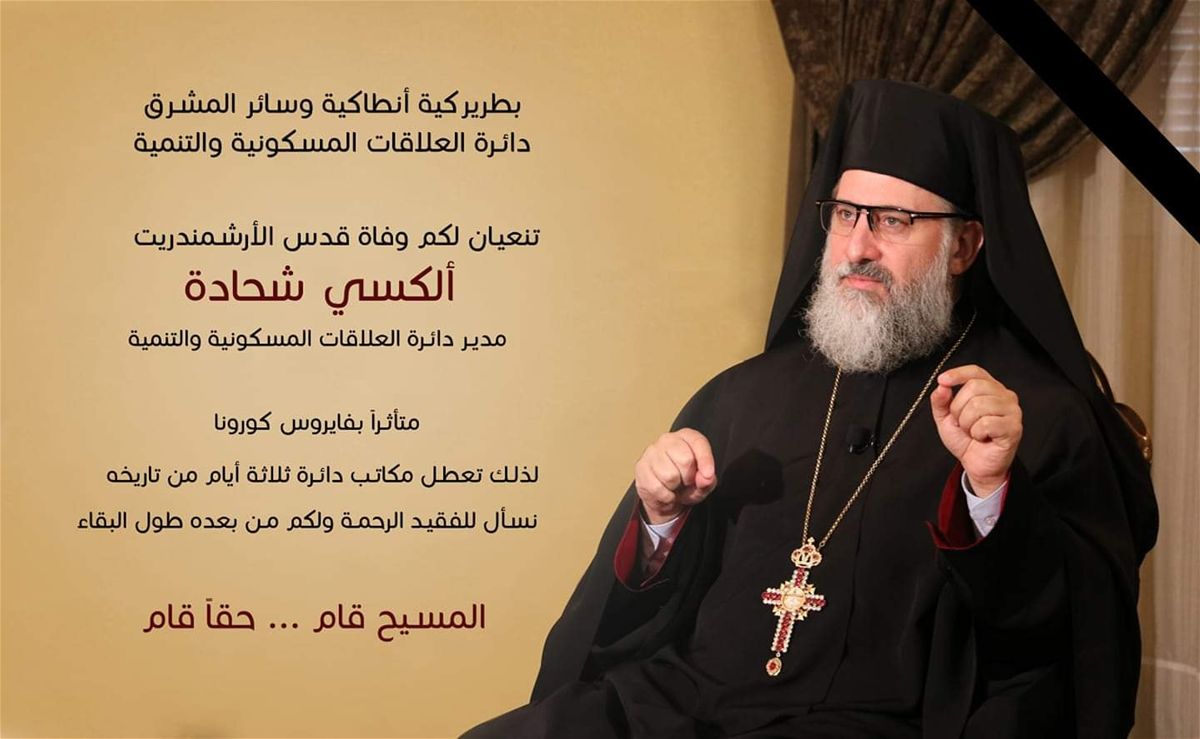 نعت بطريركية أنطاكيا وسائر المشرق للروم الأرثوذكس، مدير دائرة العلاقات المسكونية والتنمية التابعة للبطريركية، الأرشمندريت ألكسي شحادة، الذي توفّي متأثراً بإصابته بفيروس "كورونا" المستجدّ. اشترك فى النشرة البريدية لتحصل على اهم الاخبار بمجرد نشرها تابعنا على مواقع التواصل الاجتماعى