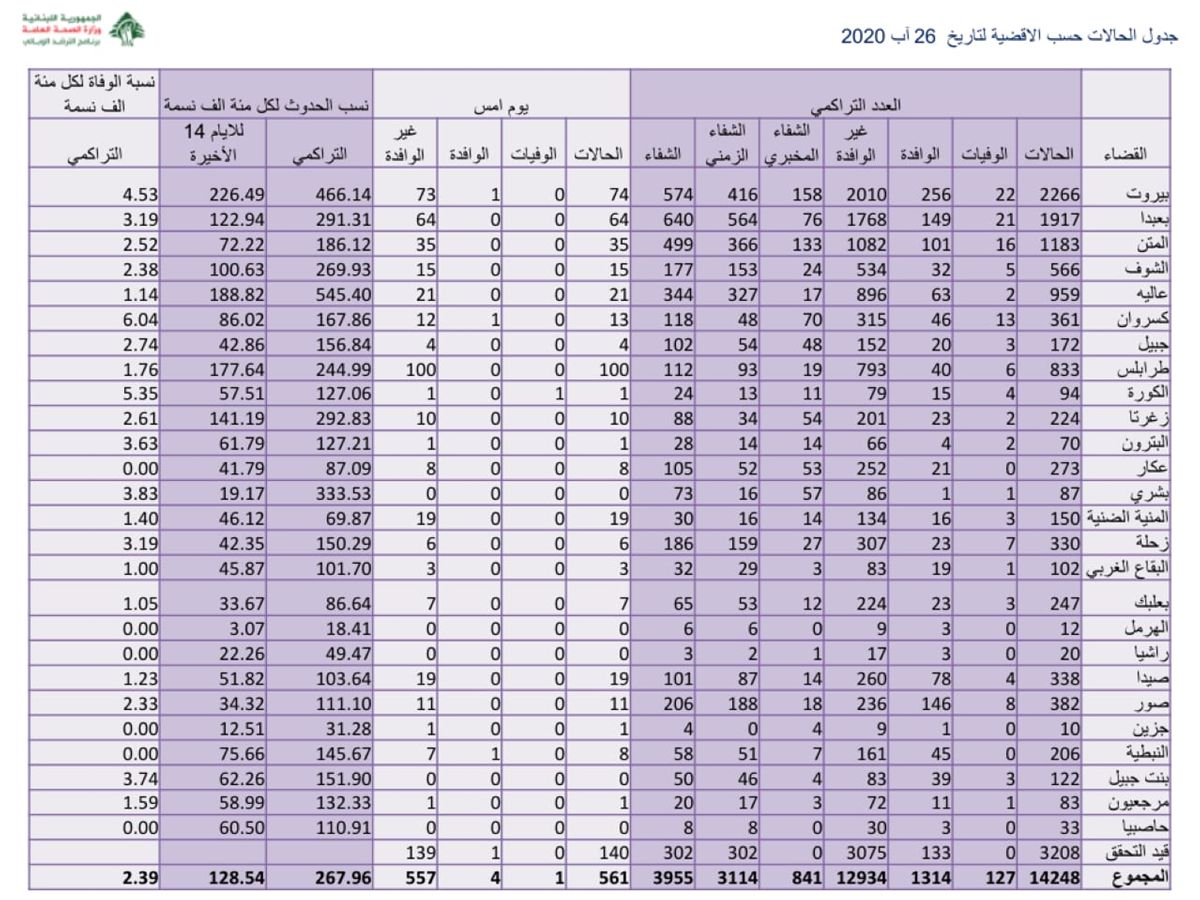 أعلنت وزارة الصحة عن 561 إصابة جديدة بكورونا، ليصبح العدد الاجمالي 14248.