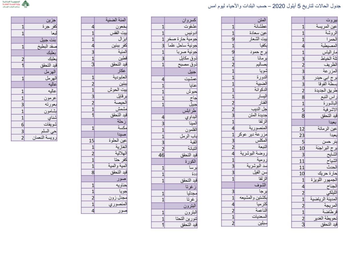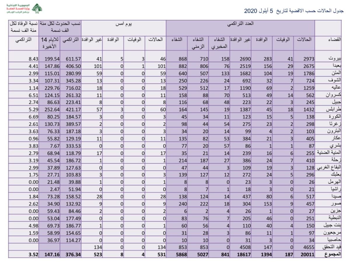 نشرت وزارة الصحة التقرير المفصّل حول إصابات كورونا، أوردت فيه كيفية توزيع الإصابات التي تمّ الإعلان عنها اليوم على مختلف الأقضية والبلدات. اشترك فى النشرة البريدية لتحصل على اهم الاخبار بمجرد نشرها تابعنا على مواقع التواصل الاجتماعى