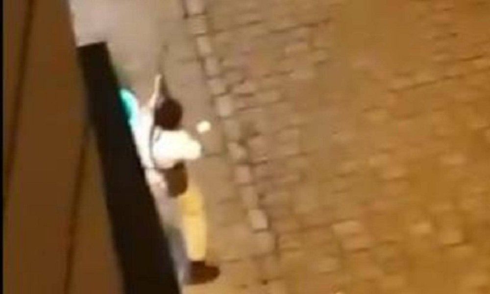 ويمكن مشاهدة رجل يرتدي زيًا أبيض بالكامل وهو يطلق النار من بندقية تبدو آلية في شارع ضيق، فيما يمكن سماع أصوات أعيرة نارية متداخلة.