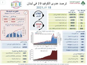 سجّل لبنان 3757 إصابة جديدة بفيروس كورونا و73 حالة وفاة، بحسب ما أعلنت وزارة الصحة. وارتفع عدد الوفيات منذ بدء الجائحة الى 5609 والاصابات الى 430734. اشترك فى النشرة البريدية لتحصل على اهم الاخبار بمجرد نشرها تابعنا على مواقع التواصل الاجتماعى