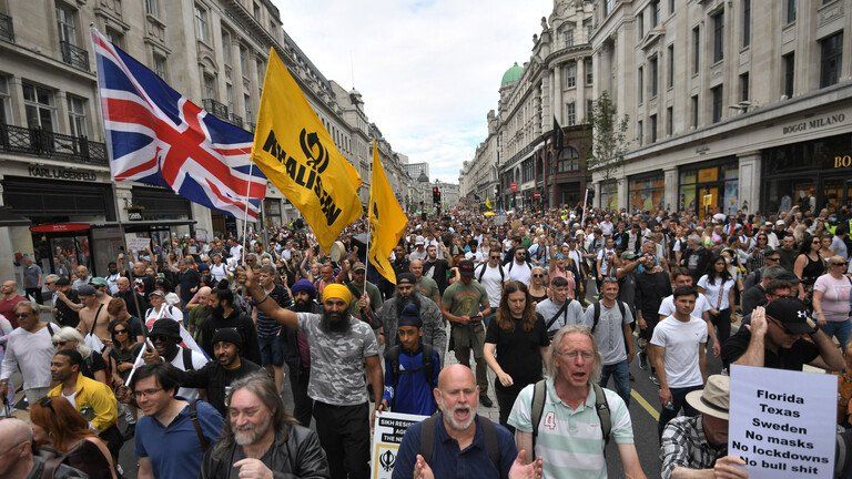 تظاهر الآلاف في وسط العاصمة البريطانية لندن احتجاجا على قيود مكافحة فيروس كورونا، بعد تأجيل رفع آخرها إلى تموز المقبل بسبب زيادة عدد الإصابات بالفيروس.
