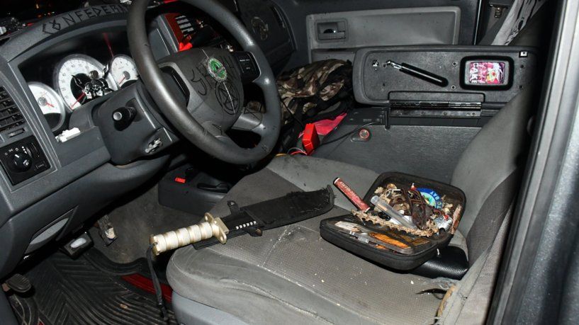 وأضاف البيان إنه بعد تفتيش الشاحنة، وجد فيها سلاح أبيض “حربة” وقد قبض على صاحبها، دونالد كريغيد، 44 عاما، بسبب حيازته “أسلحة محظورة”.